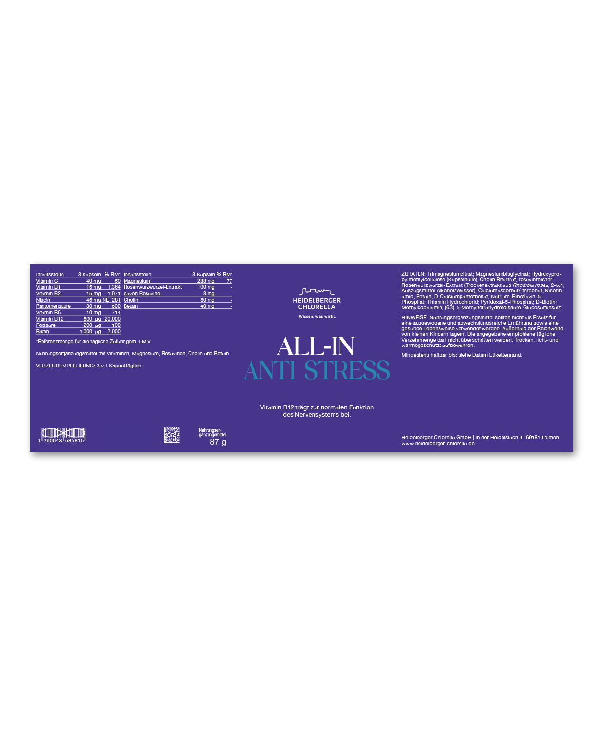 ALL-IN Anti Stress ist die perfekte Unterstützung für Menschen, die in stressigen Zeiten Ruhe und Gelassenheit suchen. Unsere Rezeptur enthält eine ausgewogene Mischung aus Magnesium, B-Vitaminen und pflanzlichen Inhaltsstoffen, die das Nervensystem in seiner normalen Funktion unterstützen.