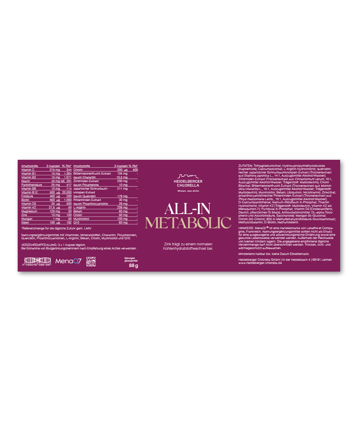 Trimagnesiumcitrat; Hydroxypropylmethylcellulose (Kapselhülle); Calciumascorbat; L-Arginin Hydrochlorid; quercetinreicher Japanischer Schnurbaumblüten und -knospen-Extrakt (Trockenextrakt aus Sophora japonica L., 15-20:1, Auszugsmittel Wasser); Zimtrinden-Extrakt (Trockenextrakt aus Cinnamomum verum, 10:1, Auszugsmittel Alkohol/Wasser; Trägerstoff: Maltodextrin); Cholin Bitartrat; Bittermelonenfrucht-Extrakt (Trockenextrakt aus Momordica charantia L., 15:1, Auszugsmittel Alkohol/Wasser; Trägerstoff: Maltodextrin); Myoinositol; Betain; Ubiquinon; Nicotinamid; Zinkcitrat; proanthocyanidinreicher Pinienrinden-Extrakt (Trockenextrakt aus Pinus massoniana Lamb., 15:1, Auszugsmittel Alkohol/Wasser); D-Calciumpantothenat; Natrium-Riboflavin-5-Phosphat; Thiamin Hydrochlorid; Vitamin K2 (Trägerstoff: Maltodextrin, Vitamin K2 als Menaquinon-7); Pyridoxal-5-Phosphat; Vitamin D3 (Trägerstoffe: modifizierte Stärke, Maltodextrin, Saccharose, pflanzliches Öl (Mais), Antioxidationsmittel: stark tocopherolhaltige Extrakte, Natriumascor-bat, Trennmittel: Siliciumdioxid, Cholecalciferol); Mangan (II)-Gluconat; Chrom (III)- Chlorid; (6S)-5-Methyltetrahydrofolsäure-Glucosaminsalz; Methylcobalamin; D-Biotin; Natriumselenit.